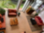 Sala de doble altura con acabados de madera, ventanales amplios con vista hacía el jardín dando una sensación de completa relajación.